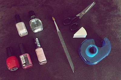 | Le matériel - Une base rose pâle - Un vernis top coat - Un vernis rouge - Un vernis fushia - Un vernis rose clair - Une éponge - Un pinceau - Du scotch - Un ciseau |